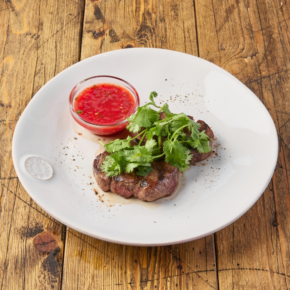 Приготовлено на гриле- говядина вырезка, соус аджика (помидоры, перец болгарский, лук репчатый, чеснок, кинза, соус шрирача, уксус винный, соль моркая, сахар песок), масло оливковое, кинза, соль морская, перец черный