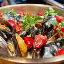 Чилийские мидии в сливочном соусе с сырами Скаморца и Качотта, с добавлением белого вина, спелых томатов и свежей петрушки