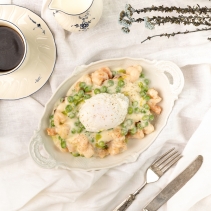 Гратен из кабачков с креветками, зеленым горошком, соусом бешамель, яйцом пашот, зеленым маслом и микрозеленью