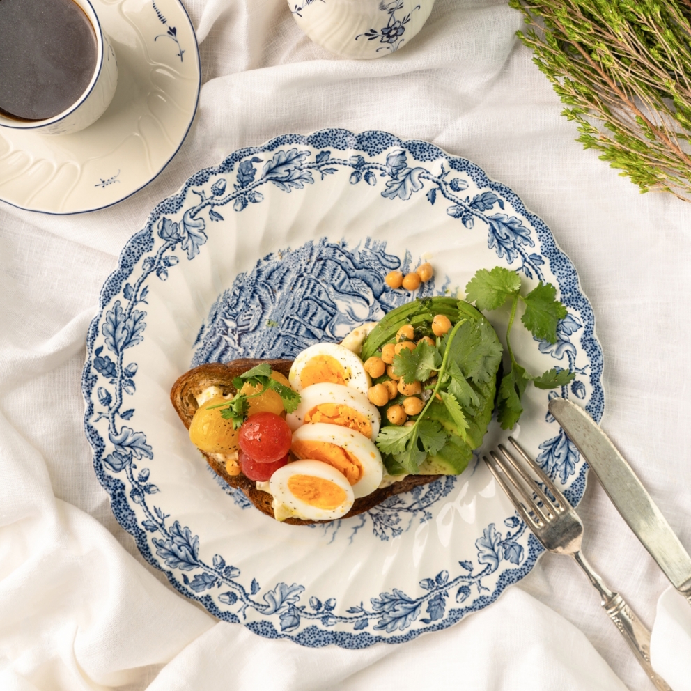 Хлеб серый, соус тартар (огурец соленый, горчица зерно, лук, майонез, сметана), яйцо, авокадо, томаты черри, нут, мята, зелень