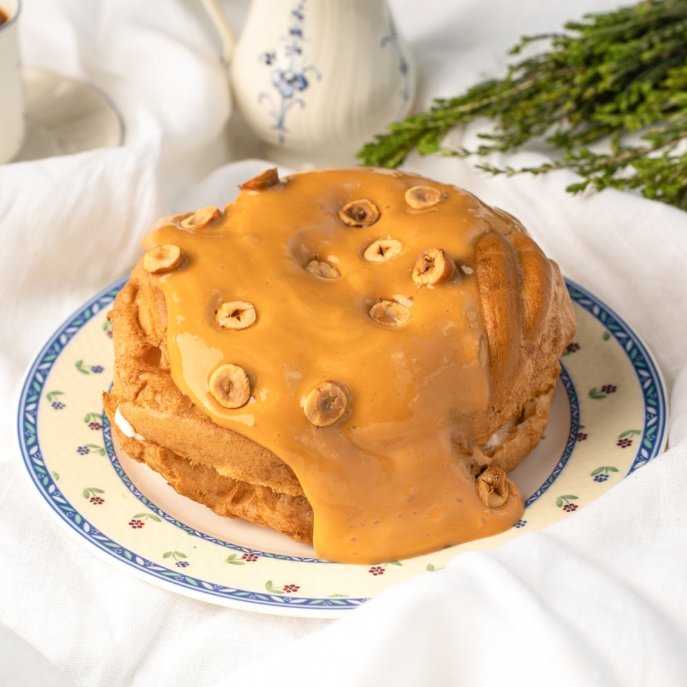 Воздушное кольцо из заварного теста с кремом на основе сгущённого молока, украшенное обжаренным фундуком, лёгкий десерт с тёплой ноткой карамели и ореховой сладости