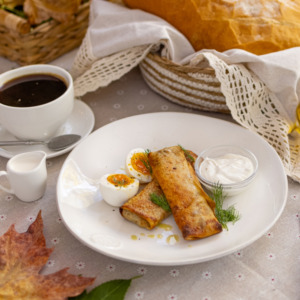 Тесто на блины (сливки 33%, масло подсолнечное, молоко 3,2%, мука пшеничная, яйцо куриное, сахар песок, соль), фарш (говядина мякоть, лук репчатый, яйцо куриное, масло сливочное 82,5%, соль, перец молотый), масло подсолнечное, сметана, укроп, яйцо куриное