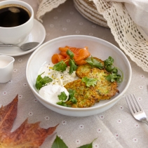 Оладьи (кабачок, морковь, соль, яйцо, кинза, масло оливковое, перец черный молотый), страчателла, кинза, лосось с/с, масло оливковое, масло подсолнечное, перец молотый, яйцо куриное