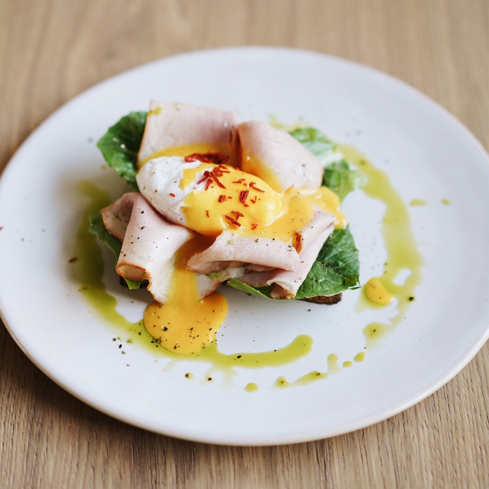 Бриошь с яйцом пашот, соусом голландез, тонкими ломтиками тамбовского окорока и муссом из домашней Рикотты