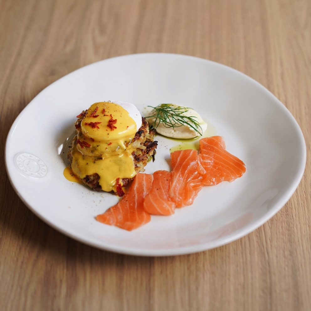 Драники (картофель, кабачок, соль морская, перец черный молотый, мука, масло растительное), соус голландез (яйцо куриное, масло сливочное, соус крем бальзамик, соль морская, куркума), мусс рикотта (рикотта, сливки 33%, масло оливковое, соль морская, перец черный), масло зеленое, сушеные томаты, укроп, лосось с/с, черный перец