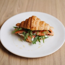 Круассан со Страчателлой, слабосоленым лососем, розовыми томатами и руколой