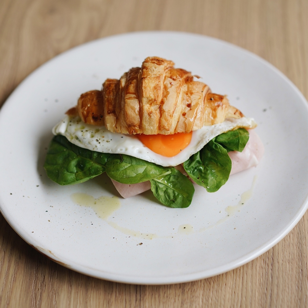 Круассан с муссом из Рикотты, слайсами огурцы, тонкими ломтиками Мортаделлы и яичницей