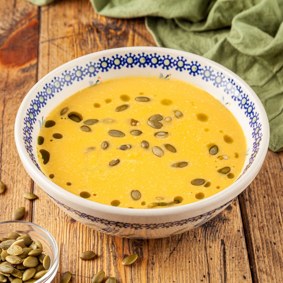 Суп (тыква свежая, вода питьевая, сливки 33%, масло подсолнечное рафинированное, сахар песок, соль морская, масло сливочное 82,5%, шалфей свежий, паста карри), креветки, семечки тыквенные обжаренные, масло зеленое (масло оливковое, шпинат, петрушка), перец горошек молотый