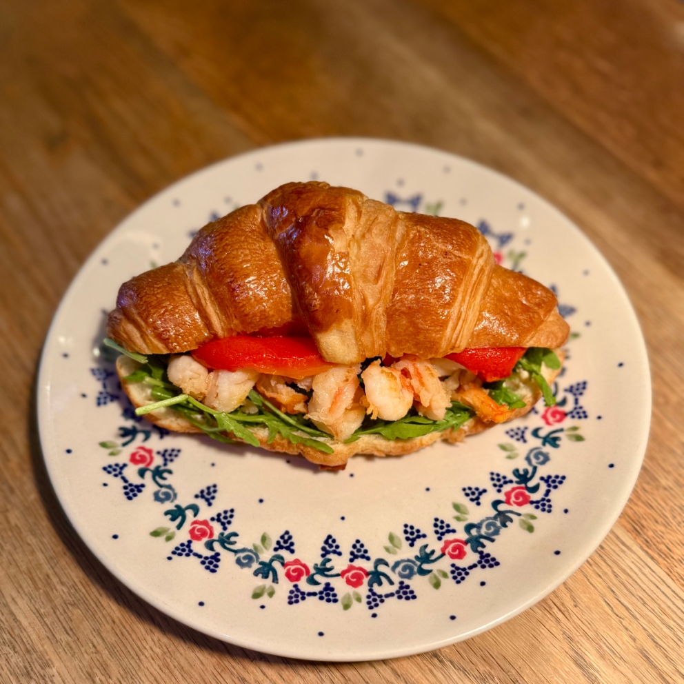 Круассан, креветки, болгарский перец, рукола, чеснок, зелень, горчица, майонез, сметана, ворчестер, растительное масло