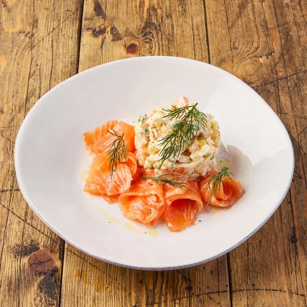 Салат (картофель отварной, яйцо куриное отварное, майонез, горошек зеленый с/м бланшированный, огурцы, морковь отварная, огурцы соленые, соль морская, перец черный ), лосось слабосоленый (лосось филе, соль морская, сахар песок), укроп, масло оливковое, перец черный