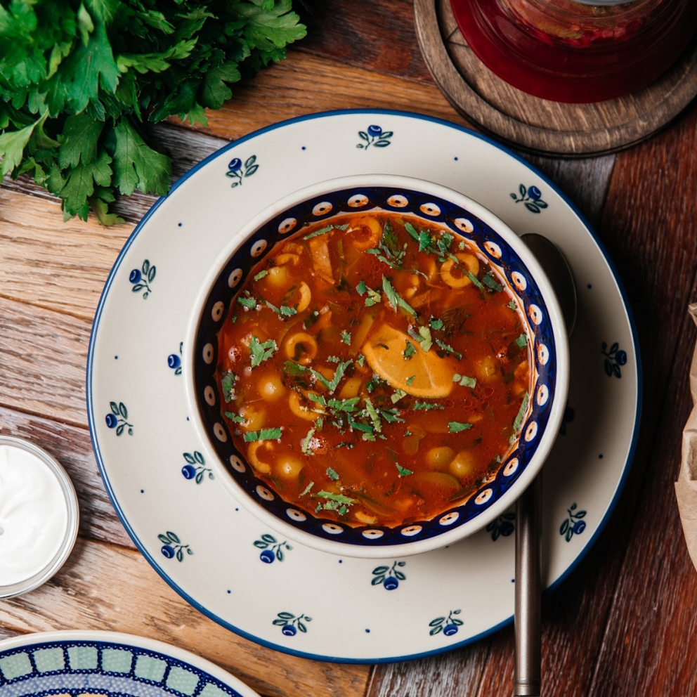 Мясной бульон с отварным говяжьим языком, тамбовским окороком, говяжьей грудинкой, репчатым луком, солеными огурцами, оливками и сметаной