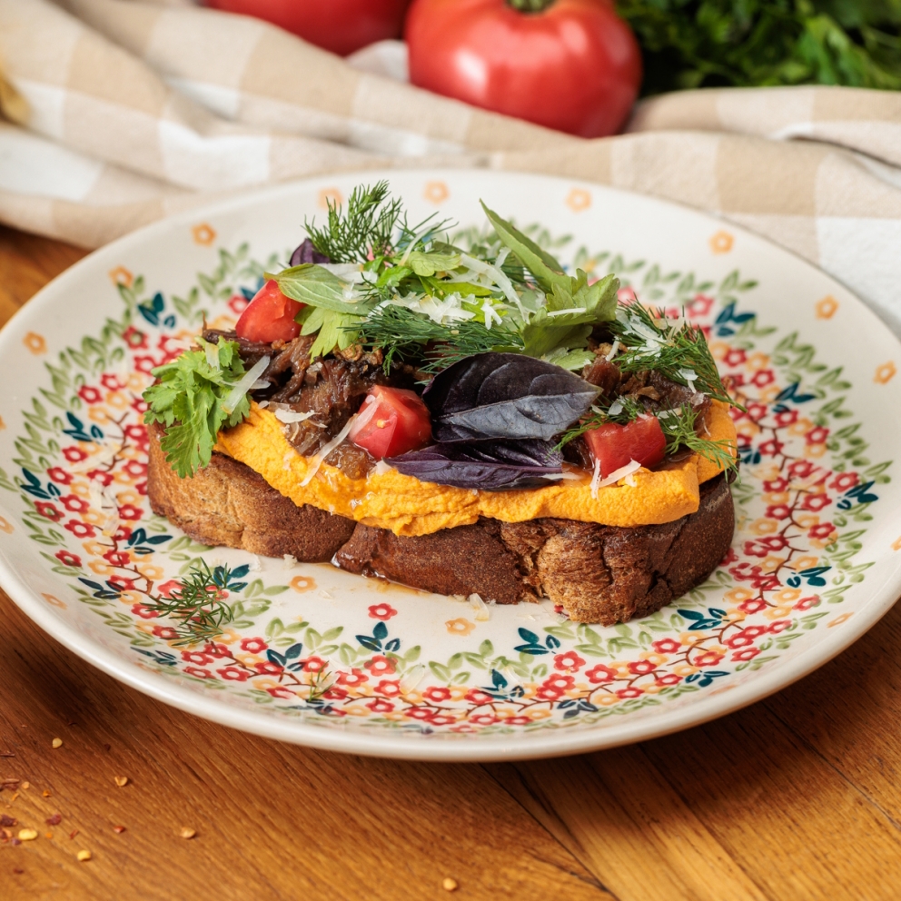 Тост с хумусом, томлеными говяжьими щечками в соусе порто, томатами конкасе, миксом зелени и сыром Скаморца