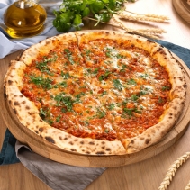 Выпеченная пицца: тесто для пиццы (мука пшеничная в/с, вода, дрожжи, соль морская), соус (помидоры в собственном соку, базилик зеленый, соль морская, масло оливковое), сыр моцарелла для пиццы, сыр моцарелла, фарш болоньеза (говядина, лук репчатый, морковь, сельдерей стебель, томаты сс), сыр пармезан, петрушка