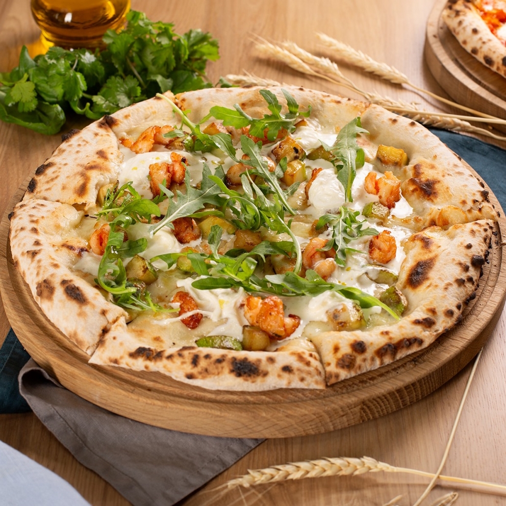 Пицца из дровяной печи с креветками, Моцареллой, сыром Страчателла , запеченными кабачками и руколой