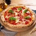 Пицца из дровяной печи со слайсами пикантной Чоризо, сыром Моцарелла, вялеными томатами и базиликом