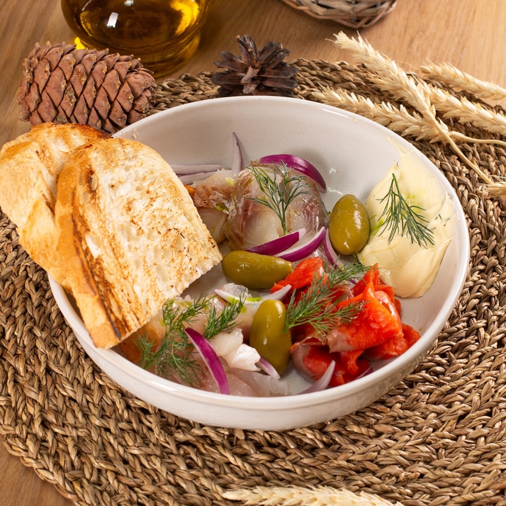 Нерка с/с (филе нерки, соль морская, сахар), хариус с/с, муксун с/с (филе муксуна, соль морская, сахар, масло сливочное, лук красный крымский, укроп, оливки, масло зеленое (масло оливковое, кинза, петрушка, укроп, шпинат), хлеб белый