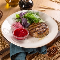 Бифштекс из оленины с брусничным соусом, миксом зелени, сладким крымским луком и солеными груздями