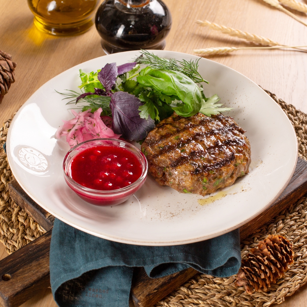 Фарш на бифштекс из оленины (оленина тазобедренная, говяжий жир, соль, перец, кинза, лук репчатый) соус брусничный с вином (брусника с/м, сахар, крахмал, корица, укус бальзамический, масло оливковое, коньяк, еживика с/м), лук красный маринованный (лук крымский, укроп, уксус столовый, соль, сахар), микс зелени (базилик красный, зеленый, укроп, петрушка, кинза), грибы грузди соленые