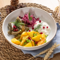 Грузди соленые, лук красный маринованный (лук крымский, укроп, уксус 9%, соль, сахар), картофель отварной, масло сливочное, сметана домашняя, укроп свежий, лук зеленый свежий, перец черный