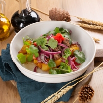 Лопатка томленая (лопатка ягненка, соус демиглас) картофельные дольки (картофель свежий, масло подсолнечное, соль) масло сливочное, помидоры узбекские, лук красный маринованный (лук крымский, укроп свежий, уксус 9%, соль, сахар) кинза свежий