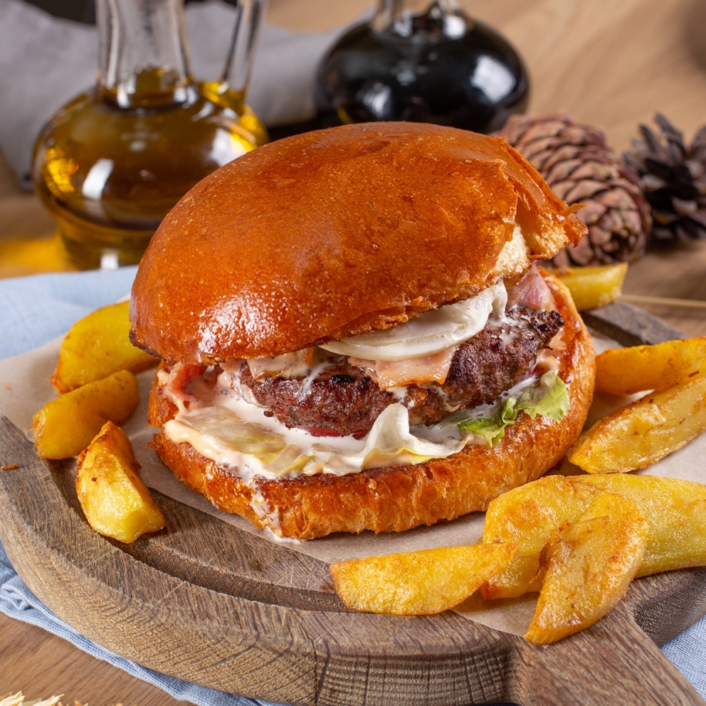 Чизбургер с сочной говяжьей котлетой, соусом демиглас, маринованными огурцами, беконом, Страчателлой и дольками картофеля