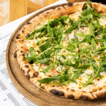Пицца из дровяной печи с Моцареллой, руколой, креветками и кальмарами со сливочным соусом и соусом свит чили