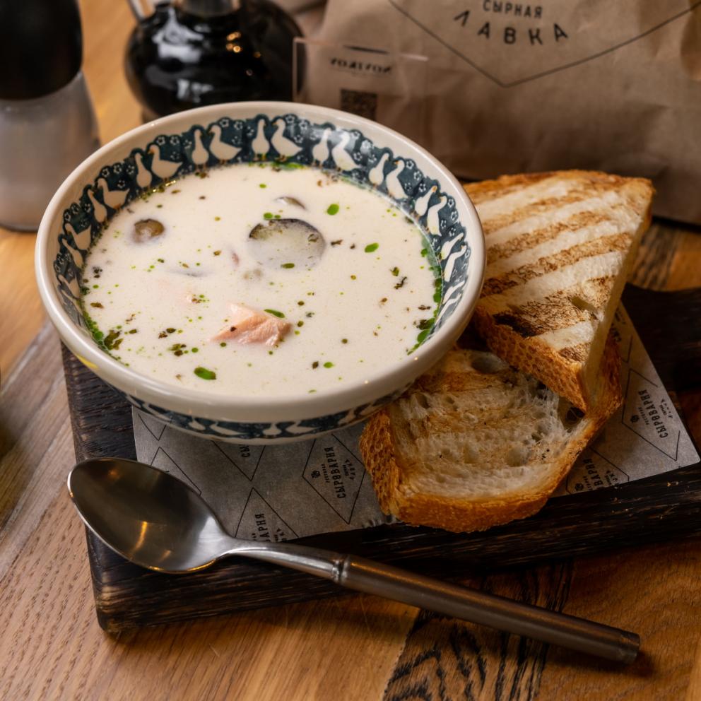 Рыбный сливочный бульон с лососем и судаком с зеленью и чиабаттой