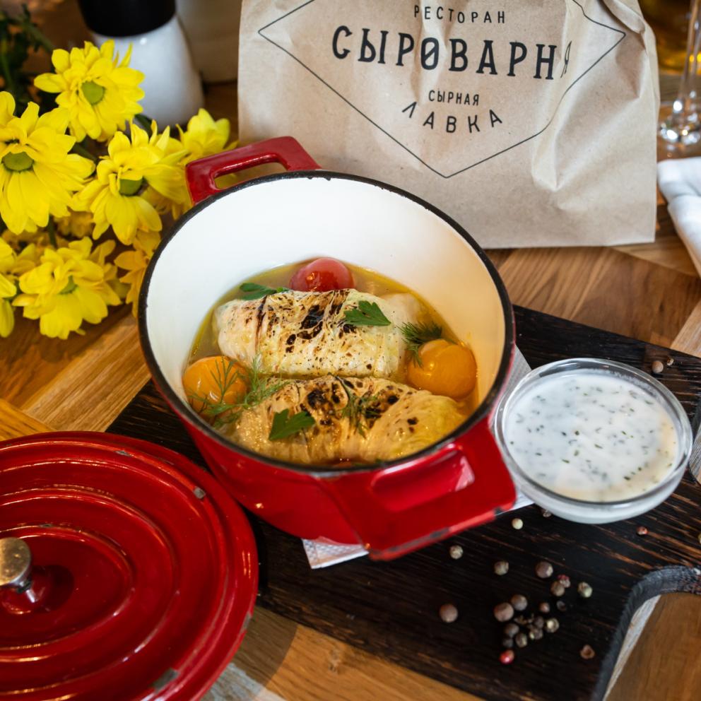 Пекинская капуста, лосось, рикотта, краб, соль, специи, сливки 33%, икорный соус (красная икра, сливки). Украшение: зеленое масло, микрозелень