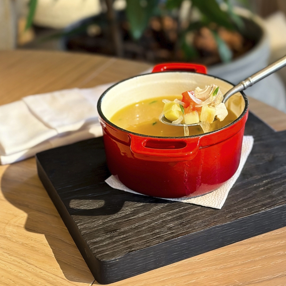 Куриный бульон, стерлядь, картофель, зеленый лук