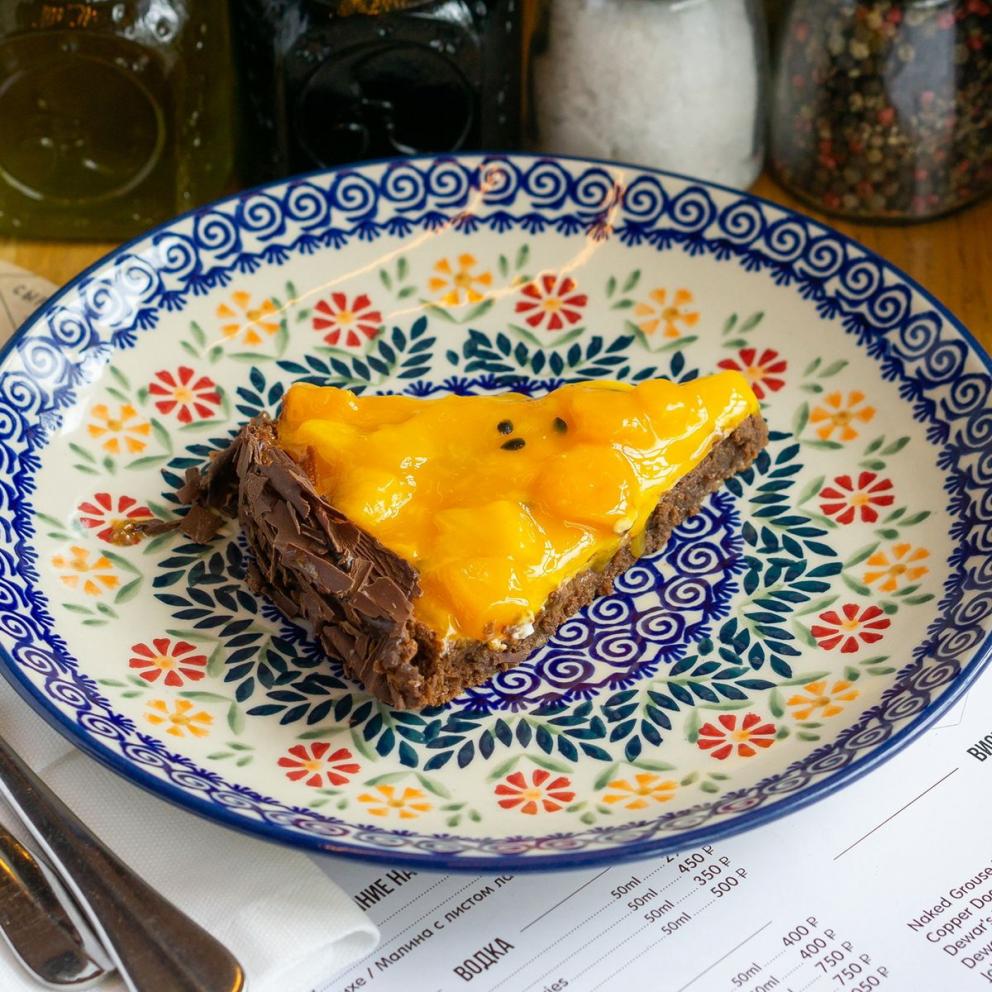 Шоколадный корж брауни из бельгийского шоколада с прослойкой из творожно-ванильногго крема с шапкой из соуса манго-маракуйя