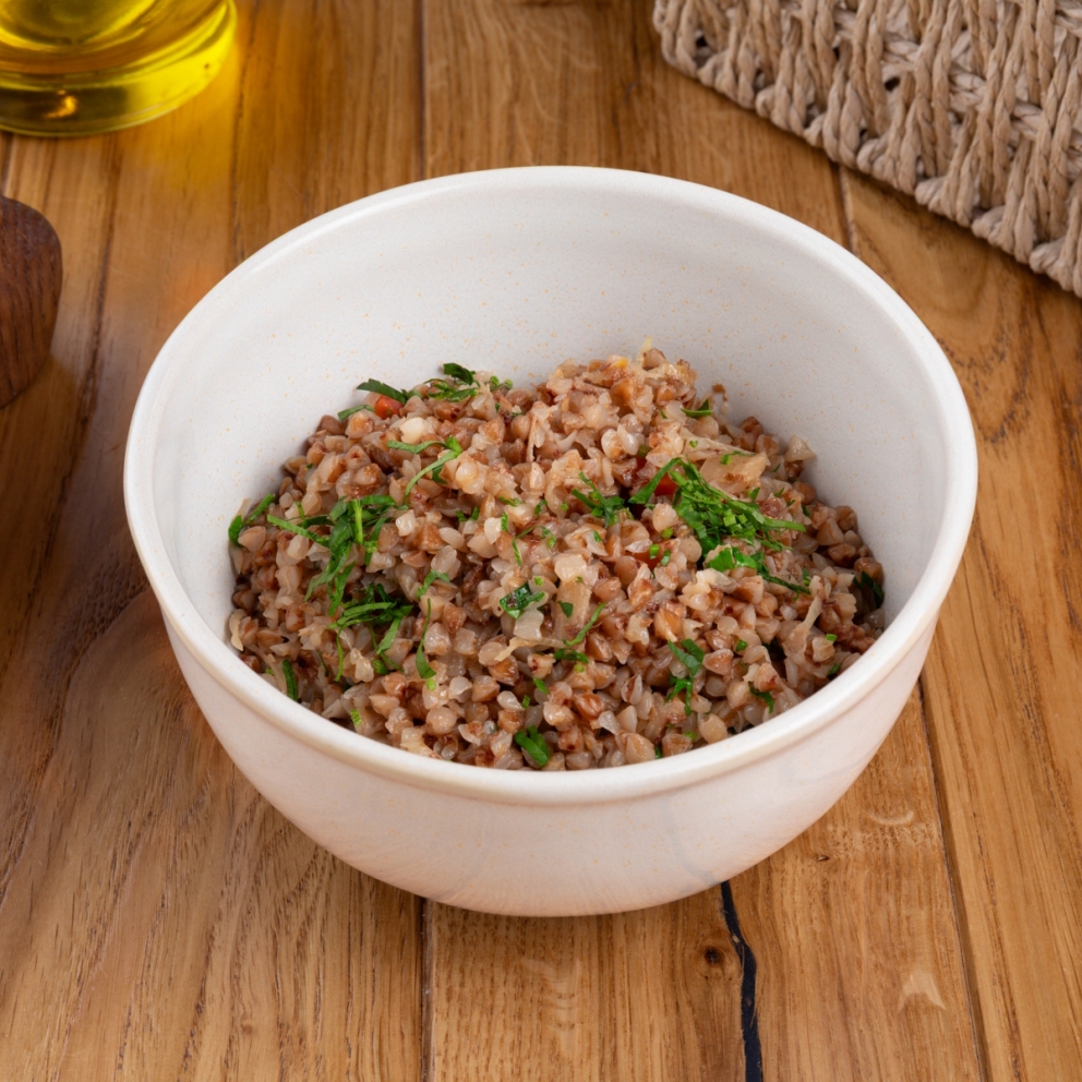 Гречка крупа отварная, капуста б/к, морковь, лук репчатый, масло подсолнечное, соль, перец черный, масло сливочное, петрушка, соль морская, масло чесночное (масло подсолнечное, чеснок)