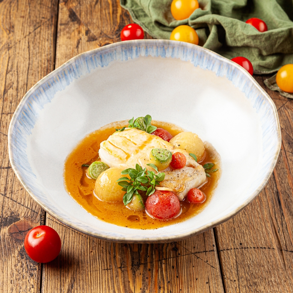 Нежное филе трески в соусе биск с томатами черри, хрустящими цукини, сладкой морковью и базиликом