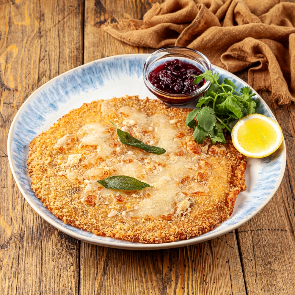 Куриный шницель с корочкой из сыра Пармезан, кисло-сладким брусничным вареньем и шалфеем