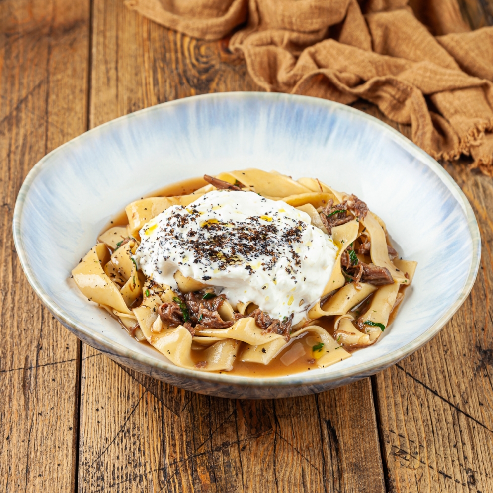 Паста домашняя паппарделле отварная, говядина грудинка томленая (говядина грудинка, масло подсолнечное рафинированное, соль морская, тимьян свежий, перец горошек молотый, розмарин свежий), сыр страчателла, масло сливочное 82,5% (соус демиглас, портвейн, лук красный, чеснок, масло подсолнечное рафинированное, соль морская, сахар песок, тимьян), масло оливковое с ароматом трюфеля, петрушка, грибы трюфель, масло чесночное (масло подсолнечное рафинированное, чеснок)