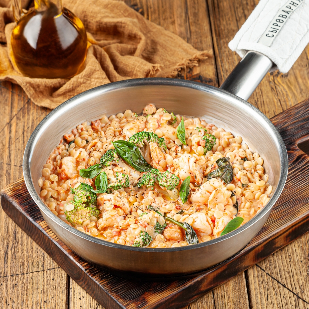 Паста птитим отварная, креветки 16/20, сливки 33%, капуста брокколи, соус пицца (помидоры в собственном соку, базилик зелёный, соль морская, масло оливковое), базилик зелёный, масло чесночное (масло подсолнечное рафинированное, чеснок), соль морская, масло оливковое, тимьян свежий, перец горошек молотый