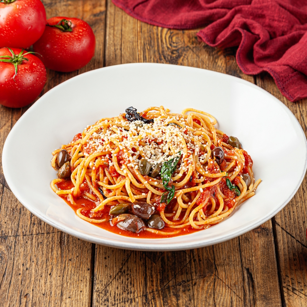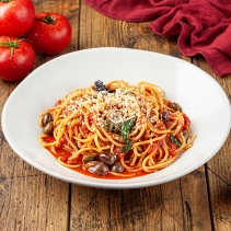 Паста домашняя спагетти отварная, соус пицца (помидоры в собственном соку, базилик зеленый, соль морская, масло оливковое), лук красный, масло сливочное 82,5%, масло оливковое, масло подсолнечное рафинированное, оливки таджасские консервированные, масло чесночное (масло подсолнечное рафинированное, чеснок), перец горошек молотый, каперсы консервированные, анчоусы консервированные, базилик зеленый, сыр пармезан, сахар песок, соль
