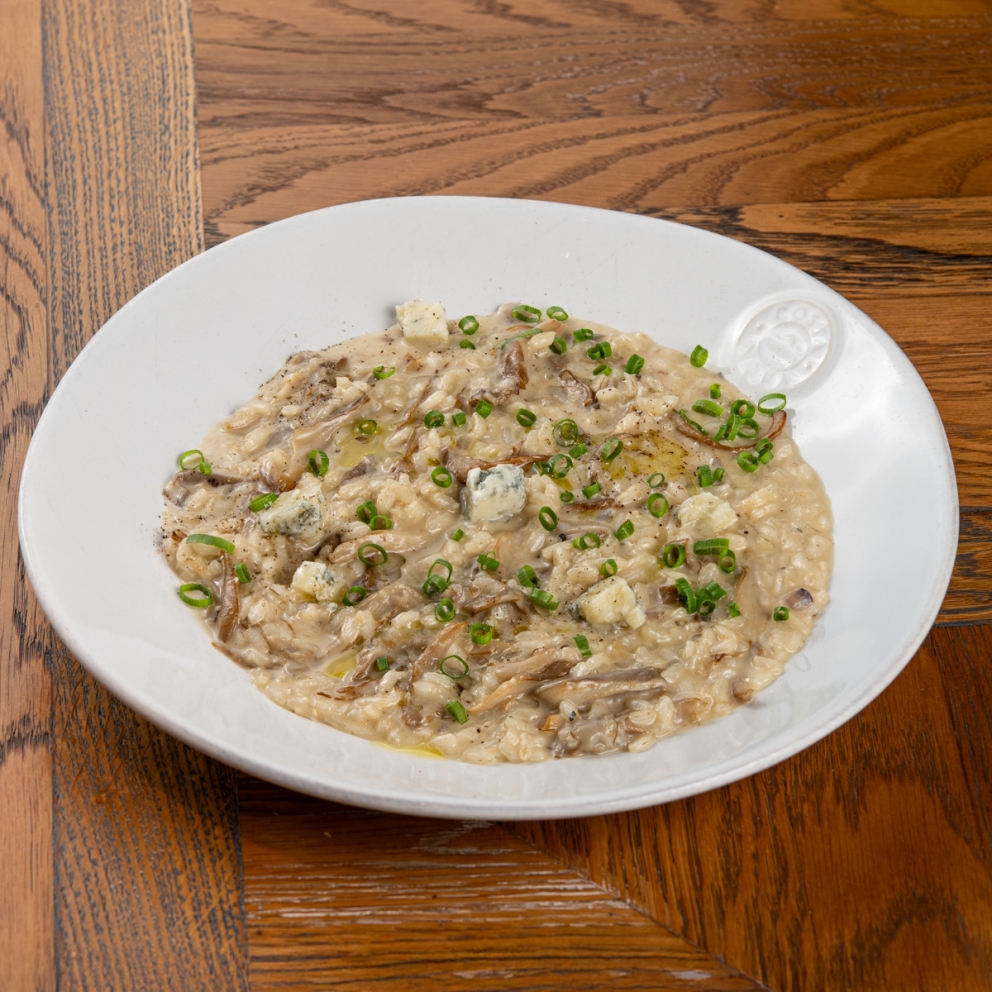 База ризотто (рис карнароли ,бульон куриный, виное белое, масло растительное, лук репчатый, чеснок, тимьян), лук красный крымский, масло оливковое, вешенки, масло чесночное (оливковое масло, чеснок), масло сливочное 82,5%, бульон куриный, пармезан, горгонзола, соль морская, перец молотый, трюфельное масло, лук зеленый