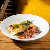 Ароматный картофельный гратен с золотистой сырной корочкой в сливочном соусе, с пикантным беконом, пряной чоризо, свежим зелёным луком и укропом