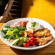 Окорок тамбовский, крупа киноа отварная, соль морская, яйцо куриное, авокадо, картофельный драник (картофель свежий, яйцо куриное, чеснок свежий, лук репчатый, соль морская, перец молотый, масло сливочное, мука пшеничная)
