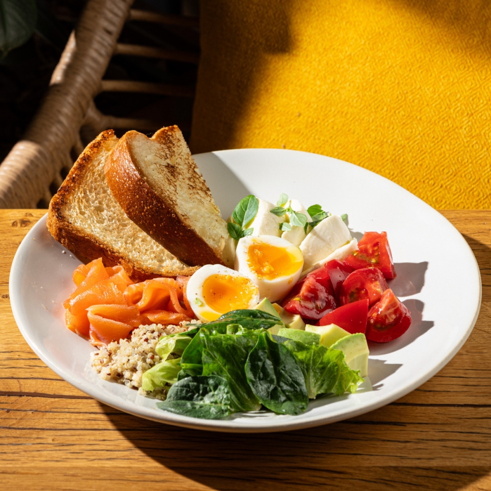 Авокадо, помидоры узбекские, сыр моцарелла, крупа киноа отварная, яйцо куриное, хлеб бриошь, салат романо, шпинат мини, лосось слабосоленый, масло оливковое, перец горошек