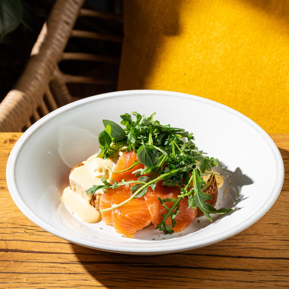 Хлеб бриошь, яйцо куриное, соус голландез (масло сливочное 72,5%, сок лимона, вино белое, соль морская, перец горошек), лосось слабосоленый, салат рукола, базилик мини, масло оливковое, перец горошек