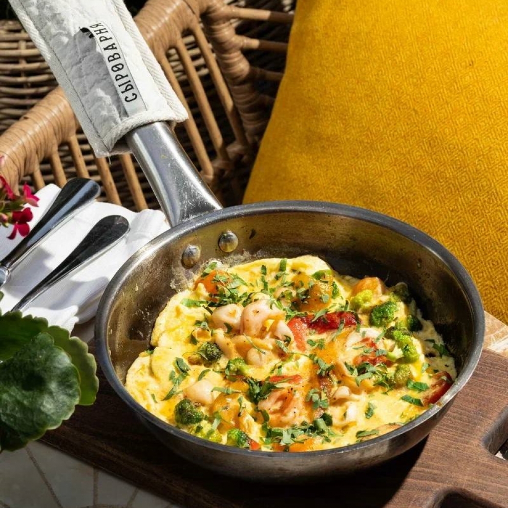Сливки 22%, креветки, кальмары, гребешки, яйцо куриное, перец черный, масло сливочное 72,5%, масло растительное, помидоры черри, перец болгарский, капуста брокколи, соль морская