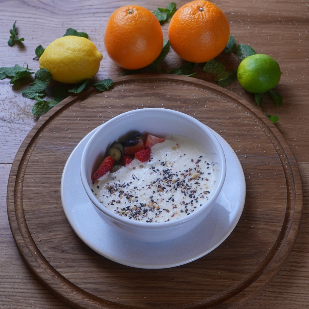 Каша манная с соленым пломбиром, свежими ягодами и ореховой крошкой