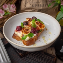 Бриошь, сливочное масло 82,5%, халлуми, масло оливковое, соус крем чиз (сливки, креметте, соль), шпинат, базилик, фисташка, малина, мед