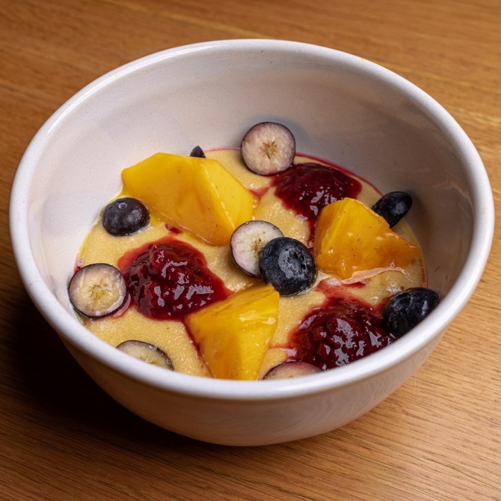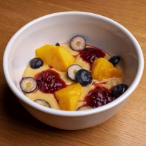 Манная крупа, молоко 3,2%, карамель (сливки 34%, масло сливочное 82%, соль, сахар), апельсиновй конфитюр (вода, сахар, цедра апельсина), хурма, голубика, масло сливочное 82,5%