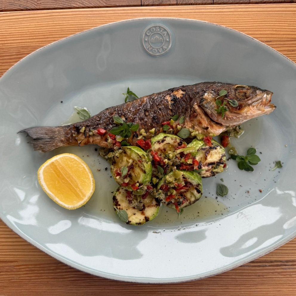 Сибас на углях под со сладким красным луком, лимонным соком, каперсами, тимьяном, душистым базиликом и гарниром из кабачка