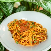 Соус (вода питьевая, соус (помидоры в собственном соку, базилик зеленый, соль морская, масло оливковое), лук репчатый, морковь, сельдерей стебель, масло подсолнечное рафинированное, сахар. песок, соль морская, зира, перец горошек молотый), паста домашняя спагетти отварная, томленый ягненок (ягненок лопатка б/к, вода питьевая, лавровый лист, перец горошек молотый, соль морская), масло сливочное 82,5%, петрушка, сыр пармезан, масло чесночное (масло подсолнечное, чеснок), масло оливковое, розмарин