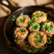 Запеченные грибы: грибы шампиньоны, масло сливочно-чесночное (масло сливочное, масло подсолнечное, чеснок, петрушка, соль морская, перец черный), сыр пармезан, петрушка