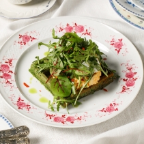 Шпинатная вафля (молоко, яйцо куриное, сахар, разрыхлитель, соль, мука, шпинат, соус кимчи), рукола, яйцо пашот, рыбный риет (лосось, угольная треска, соевый соус, тимьян, подсолнечное масло), зеленое масло, перец, сушеные томаты