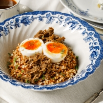 Гречка отварная, соус перечный, лук репчатый, сыр пармезан, бульон куриный, сливки 33%, масло сливочное, соль, говядина грудинка томленая, яйцо куриное, масло оливковое, лук сибулет